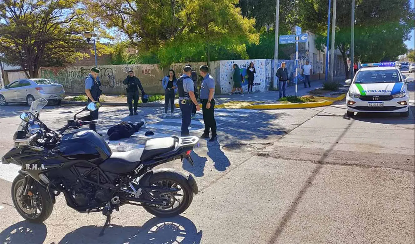 Ocurrió esta mañana, minutos antes de las 7.30 horas. Un cadete de la policía, que se dirigía a Cipolletti en su Peugeot 205 color rojo por calle 9 de Julio, colisionó a una mujer que circulaba en su bicicleta y bajaba el paso a nivel de las vías por Don Bosco.