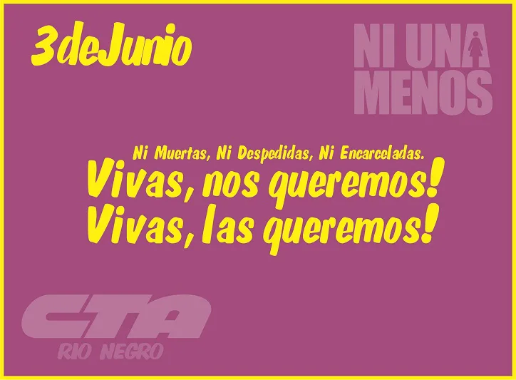 La Central de Trabajadores de la Argentina (CTA) de Río Negro convoca a participar de las actividades en el marco del llamado nacional #NiUnaMenos, de este viernes 3 de junio, contra la violencia de género bajo el lema “Ni muertas, ni despedidas, ni encarceladas. Vivas nos queremos”.