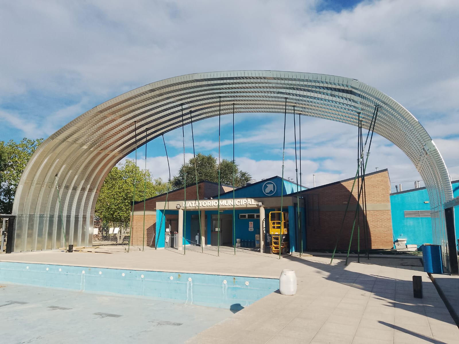 El proyecto contempla la construcción de una nave metálica de 22 metros de ancho por 38 metros de largo, con una cubierta curva que permitirá resguardar completamente tanto la piscina como las áreas perimetrales, también se incorporarán cerramientos laterales vidriados que favorecerán la iluminación natural del espacio, junto con la instalación de nuevas luminarias que mejorarán significativamente la visibilidad y la calidad ambiental interior.
