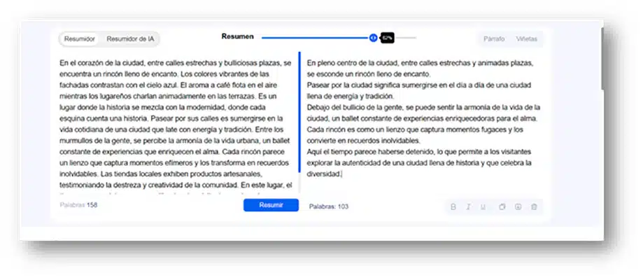 La segunda herramienta de nuestra lista se llama Resumidor de Textos. A diferencia del resumidor EditPad, esta herramienta es completamente gratuita. Proporciona dos modos de resumen diferentes llamados «Resumidor» y «Resumidor de AI».