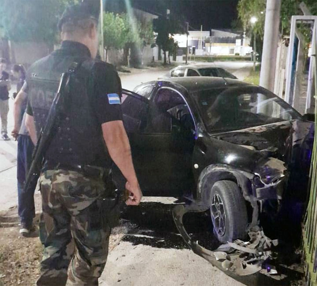 Un ciclista que pasaba por el lugar informó que el vehículo había sido sustraído minutos antes, por lo que se inició una persecución por calle Canadá hacia el oeste. En la esquina con calle Neuquén, el conductor perdió el control y chocó contra un pilar de luz y la reja de una escuela de manejo.